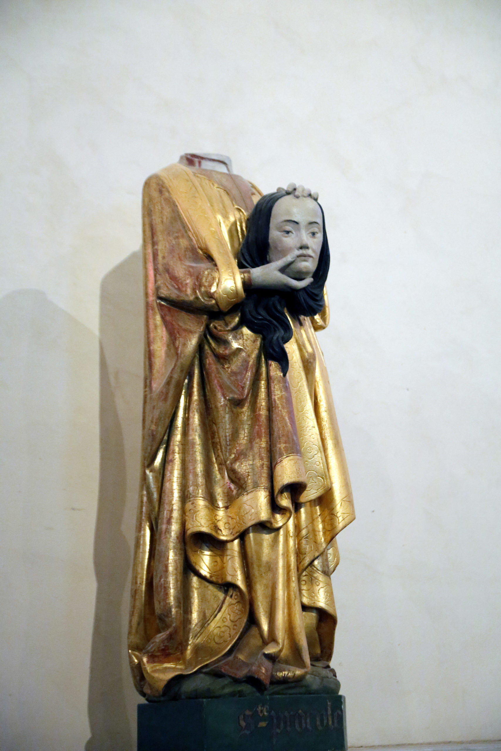 Elle était fille du comte de Rodez et s’était vouée à Dieu. Son père ayant voulu la marier à un riche seigneur, Géraud d’Aurillac (peut- être un neveu du grand saint), elle s’enfuit furtivement le jour des noces, marcha longtemps à travers le Rouergue et l’Auvergne, arriva aux collines de Gannat, alors couvertes de grands bois, et s’y réfugia. Elle y vécut quelques temps au milieu des bergers. Mais Géraud, monnayant des renseignements, découvrit sa retraite et, devant son refus obstiné de l’épouser, lui trancha la tête d’un coup d’épée, lui disant « tu n’as pas voulu de moi comme amant, tu m’auras comme bourreau ». La tradition rapporte que ce martyre eut lieu à la porte des bouchers, à la croix des Augustins.